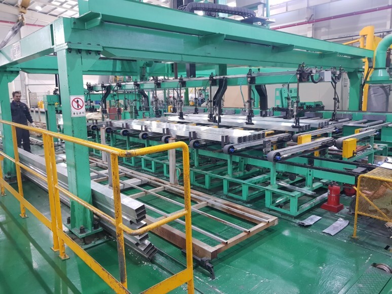 압출된 알루미늄 제품은 공기중에서 냉각시킨후 교정기로 이동시킵니다