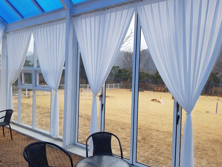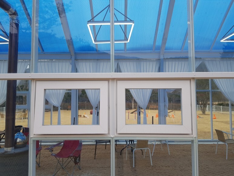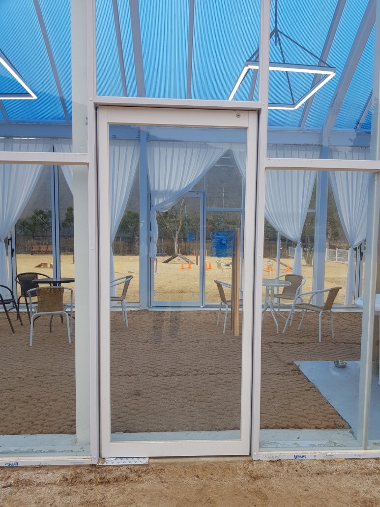 세이프도어와 알루미늄 프로젝트창, 비단열바로 간단하게 지어진 펫하우스 대기실입니다