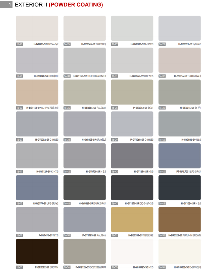 미국, 호주, 캐나다 등에서 많이 사용되며 분체도장도 색감이 다양해 실내 인테리어 제품에 많이 사용됩니다. 내구성은 도료의 종류에 따라 10~20년까지 보장됩니다