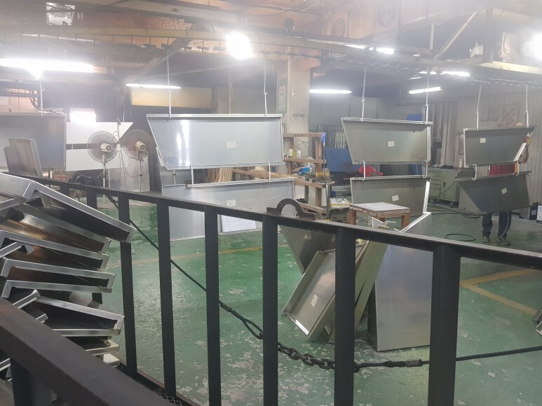 알루미늄 장바나 시트는 버티컬라인 기계에 제품을 걸어서 도장을 합니다