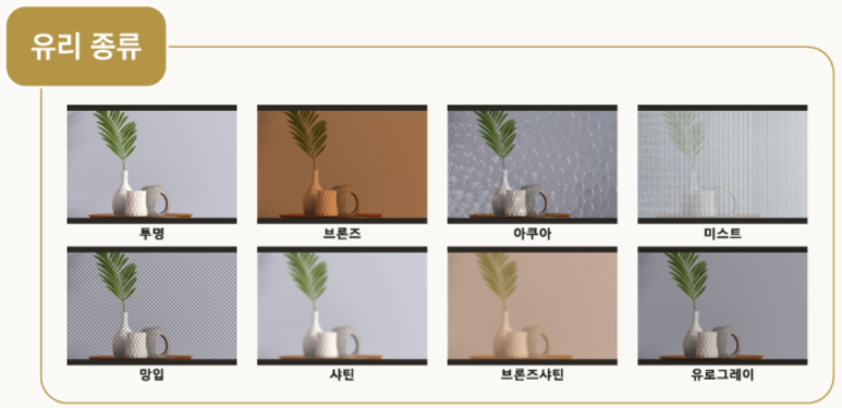 유리 : 투명,브론즈,아쿠아,모루,망입,사틴,유로그레이