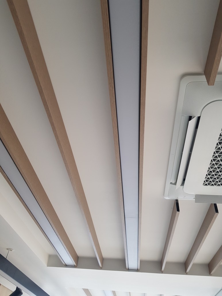 루버를 천정에 시공하고 라인조명과 포인트 조명으로 마감함으로써