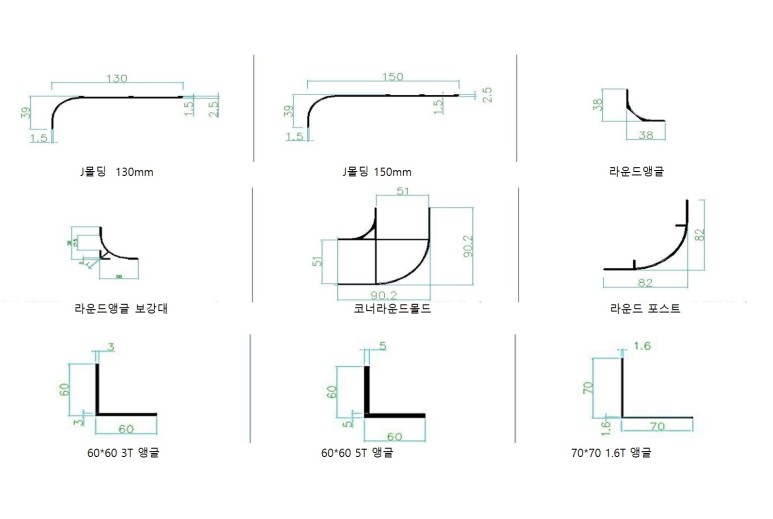 유바형태에 라운드앵글이 양쪽에 붙어 있어 따로 라운드앵글을 시공할 필요가 없는 시공이 간편한