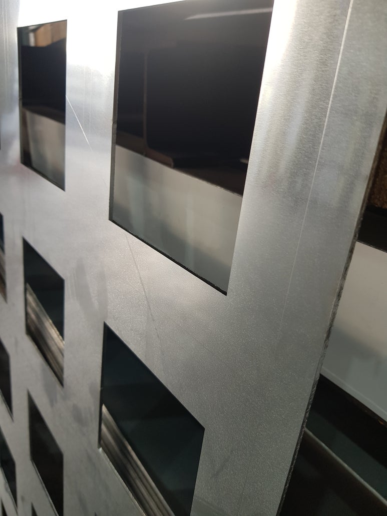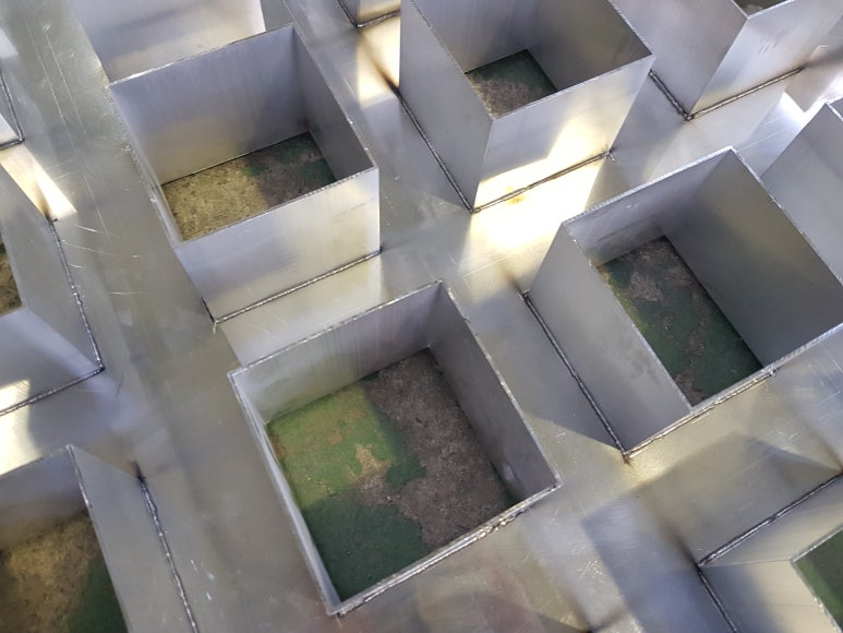 알루미늄 3T시트에 알루미늄 사각바 49개를 용접하고 높이는 100mm인 디자인 패널이 완성되었습니다.
