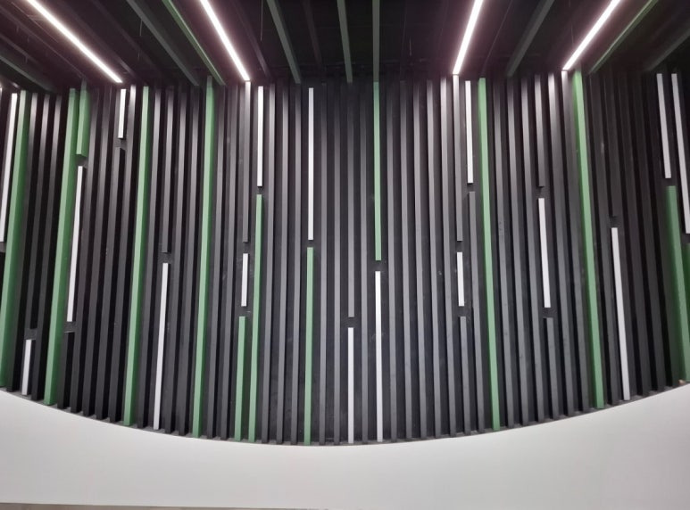 루버의 일반적인 단조로움에 변화를 주어 이어 붙이기 형식으로 시공하면서 조명루버와 녹색루버를 사용하여 묵직함을 조절하면서 일반적인 단조로움을 피하고 있습니다.