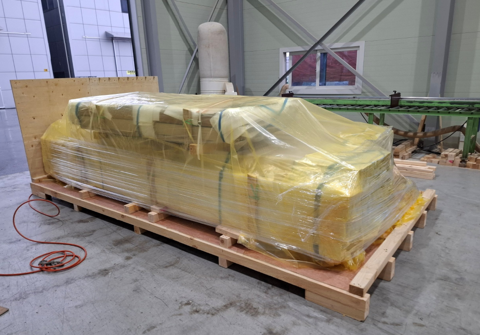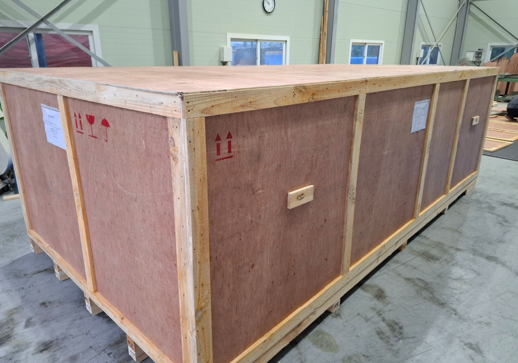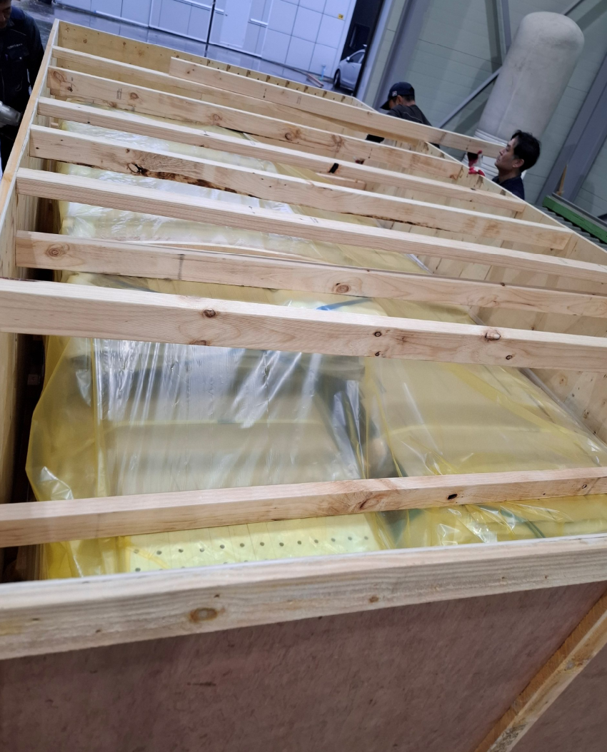 2) 목상자에 제품을 잘 배분한후에 1차밴딩을 통해 제품을 나무상자와 고정후 제품에 습기나 손상이 가지 않도록 2차 포장을 진행합니다