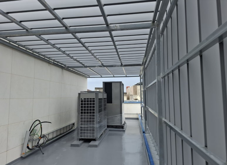 에어콘 실외기를 가려주고 건물의 온도를 낮추어 주는 동시에 통풍을 원할이 하기 위해 루버가 설치된 케이스입니다.