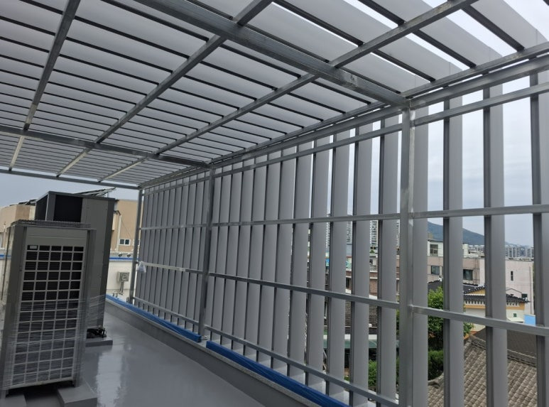형상입니다. 이곳은 에어콘 실외기가 설치된 장소로 통풍 또한 잘되어야 하기 때문에 루버가 가장 잘 맞는
