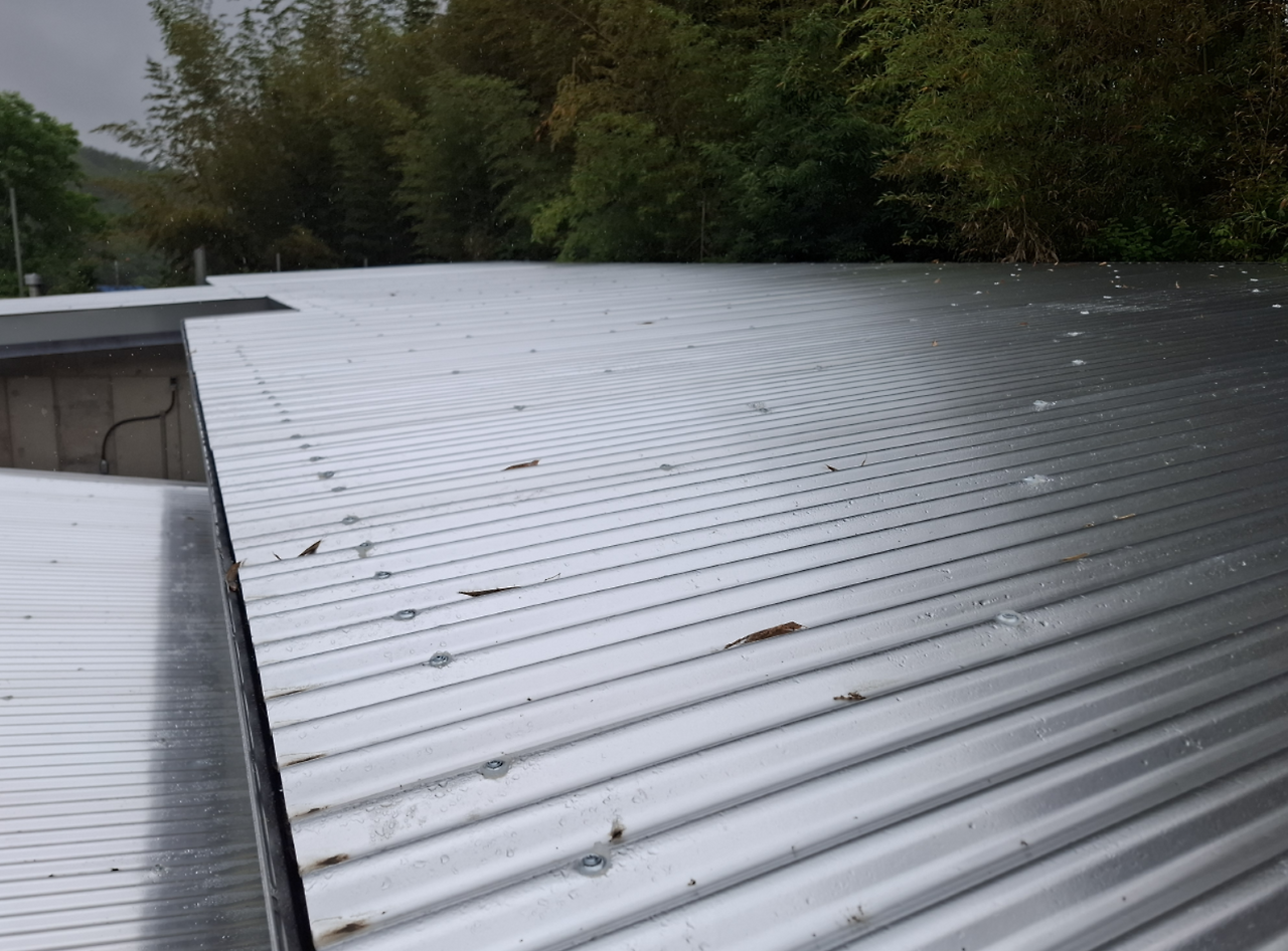 알루미늄 골강판은 지붕하지에 스텐피스로 고정되었습니다. 물론 피스에 실리콘 처리를 하여 누수를 방지하고 있습니다.