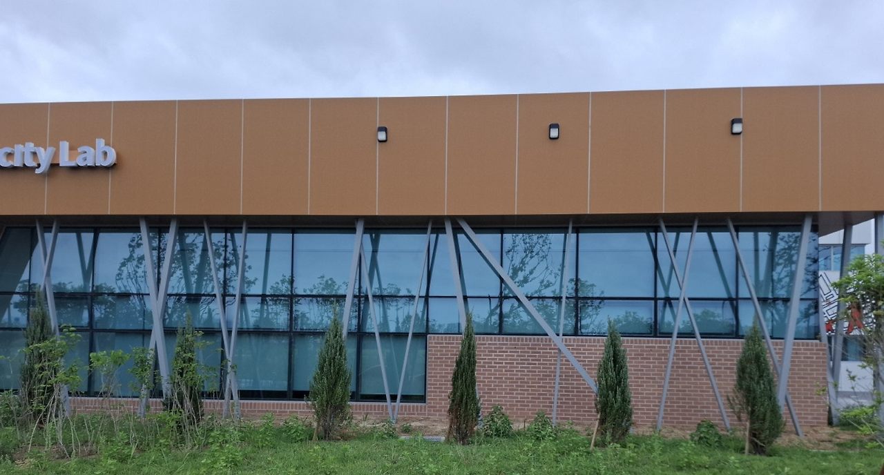 연구소 진입전면에 설치된 목무늬 루버입니다. 자칫 밋밋하기 쉬운 출입구 정면을 알루미늄 루버로 설치된 사례입니다.