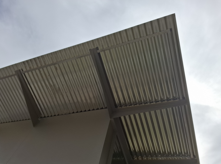 철골빔을 이용하여 지붕을 서까래 형식을 만든다음 그위에 알루미늄 골강판을 설치하였습니다